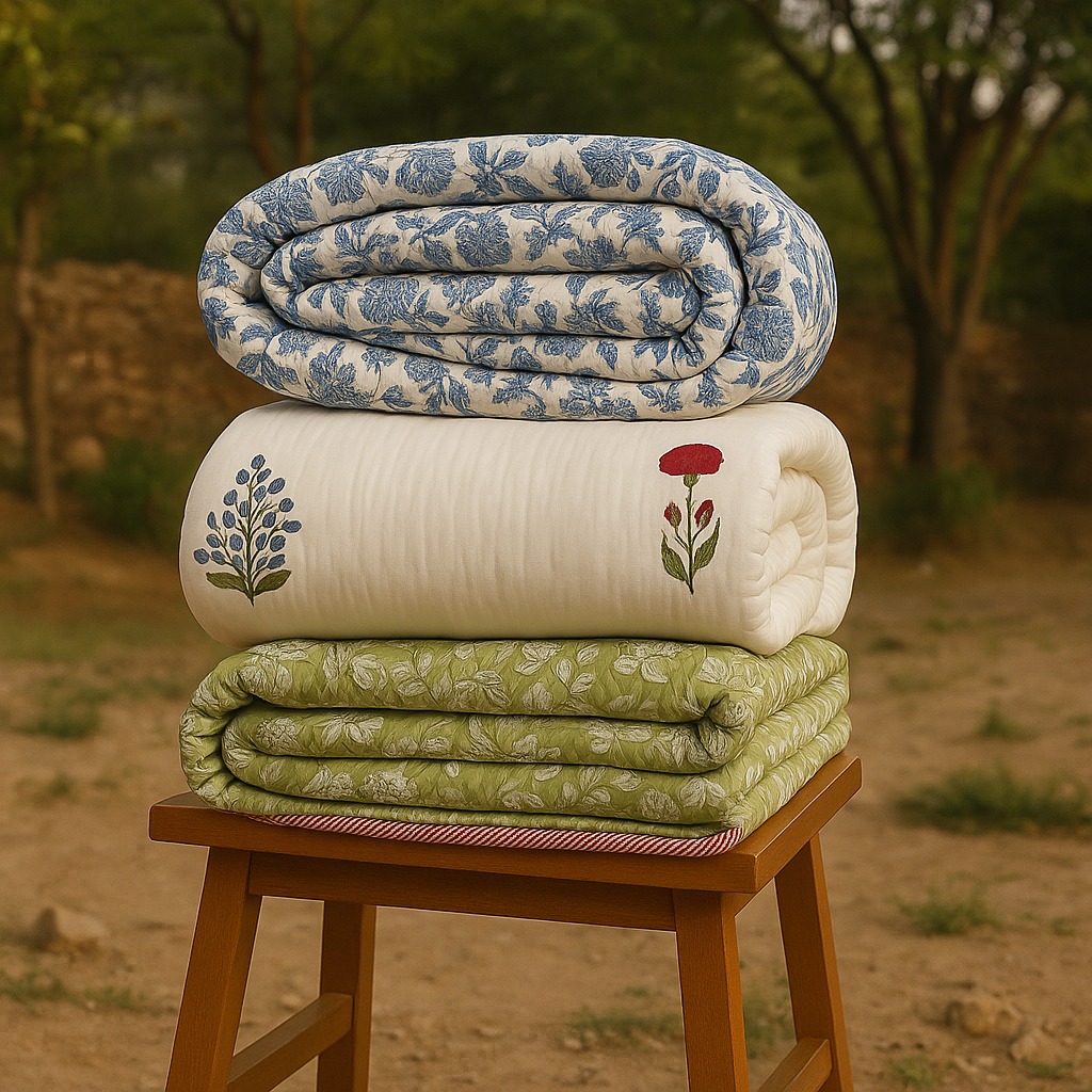 Experience the beauty of hand block printing with our collection of naturally crafted textiles. From plush quilts to elegant bedspreads and sheets, each piece is designed for comfort, style, and sustainability. Embrace the art of handcrafted luxury with Anukrati Jaipur.