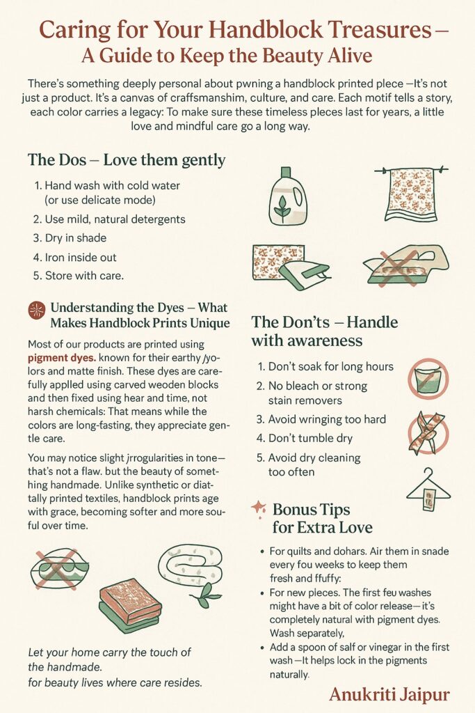 There’s something deeply personal about owning a handblock printed piece — it’s not just a product; it’s a canvas of craftsmanship, culture, and care. Each motif holds a story, each color carries a legacy. To make sure these timeless pieces last for years, a little love and mindful care go a long way.